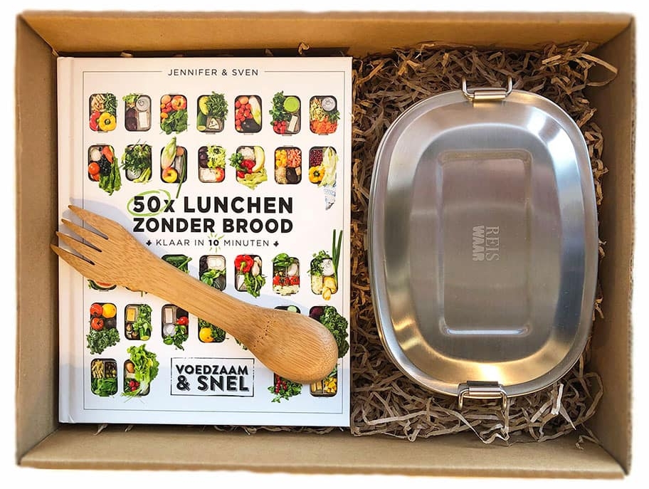 Een cadeaupakket vol lunchinspiratie. En die lunch neem je meteen mee in de herbruikbare lunchbox en eet je op met de handige spork.