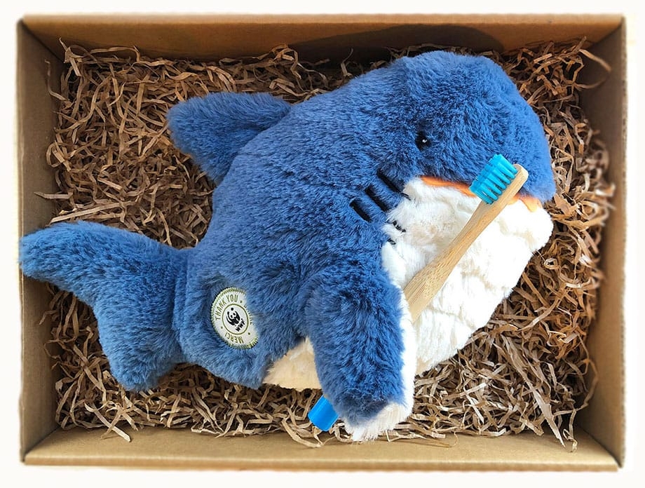 Dit is een cadeaupakket voor de starters op de tandenpoetsmarkt. Een bamboe tandenborstel en een zachte knuffel om mee naar bed te nemen.