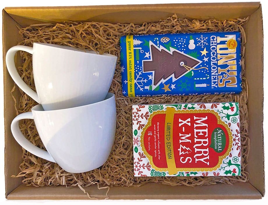 Geef een verwenmoment cadeau. Genieten van een kop kerstthee in stijl met twee mokken van het Royal servies en een kerstreep van Tony’s Chocolonely.