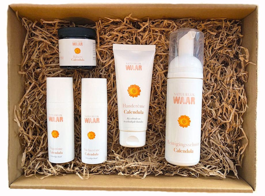 Een cadeaupakket vol verzorging, voor dag en nacht. Met een handcrème, huidbalsem, dagcrème, nachtcrème en een calendula reinigingsschuim van NatuurlijkWAAR.